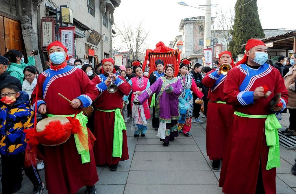 1月23日大年初二12:06,首批乘坐“韩城过大年”定制列车的400多名游客抵达韩城,走进史圣故里,感受古城悠久的文化底蕴和不一样的韩城年味。游客们沿着新开辟的“古城环线游”线路,依次游览古城三庙、民俗博物馆,欣赏非遗展览,在古城美食街品尝当地美食。行走在古城,社火、秧歌、踩高跷…… 各色非遗表演精彩纷呈,游客们纷纷拿出手机留下精彩的瞬间,抱起孩子共享这难得的欢乐时光,体验这里浓浓的年味。