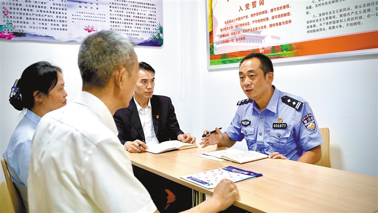 2023年12月26日,汉中市公安局汉台分局刑警大队五中队中队长杨帆(右)和群众座谈。 受访者供图