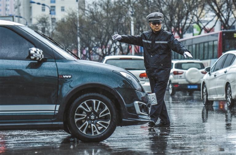 榆林市公安局交警支队民警郭勇在雨中指挥交通(资料照片)。 受访者供图