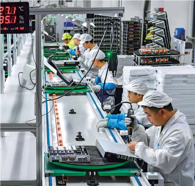 通合科技是国内领先的充电桩及电动汽车车载电源生产企业。一季度,该公司位于西安的西北总部产值达2800万元。图为近日工人在装配新能源充电桩充电模块。 记者 袁景智摄