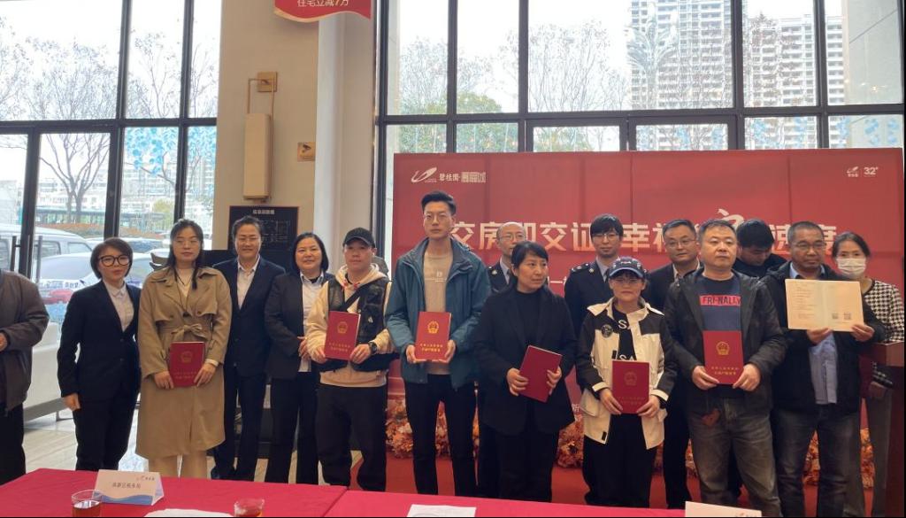 继年初高新大都荟A区实现“交房即交证”后,3月27日,碧桂园项目14号、15号、28号、29号楼也相继实现了“竣工即交房,交房即交证”,在售楼部大厅办理交房交证手续的业主脸上洋溢着喜悦的笑容。