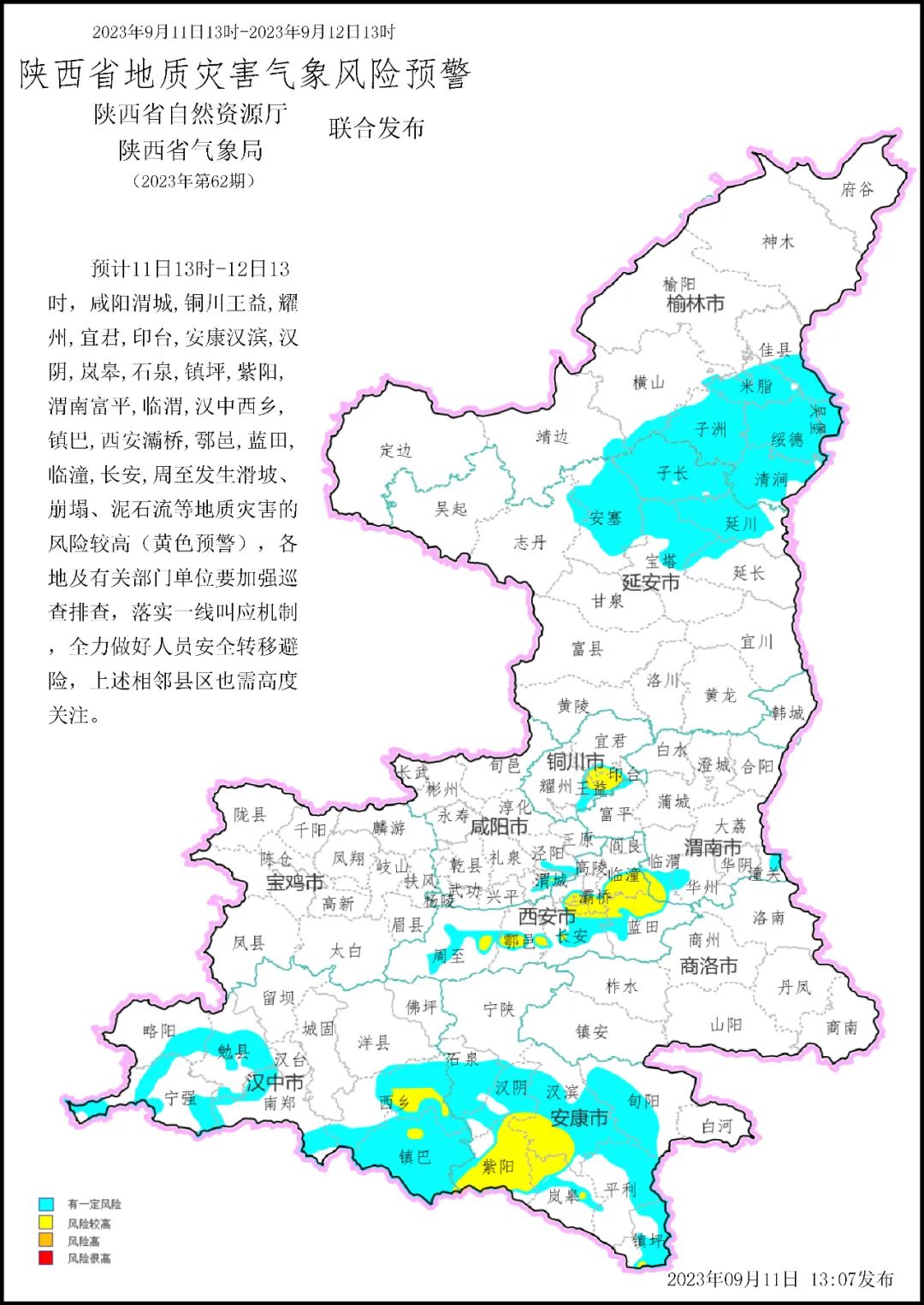 陕西省自然资源厅与陕西省气象局2023年9月11日13:00联合发布地质灾害气象风险预警:预计11日13时-12日13时,咸阳渭城,铜川王益,耀州,宜君,印台,安康汉滨,汉阴,岚皋,石泉,镇坪,紫阳,渭南富平,临渭,汉中西乡,镇巴,西安灞桥,鄠邑,蓝田,临潼,长安,周至发生滑坡、崩塌、泥石流等地质灾害的风险较高(黄色预警),各地及有关部门单位要加强巡查排查,落实一线叫应机制,全力做好人员安全转移避险,上述相邻县区也需高度关注。