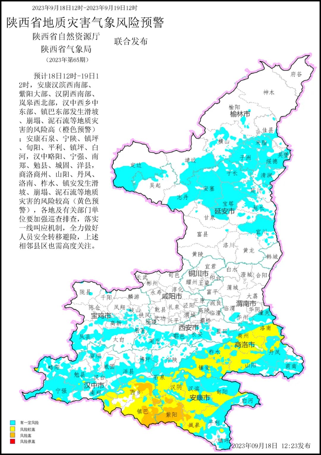 陕西省自然资源厅与陕西省气象局2023年9月18日12:23联合发布地质灾害气象风险预警:预计18日12时-19日12时,安康汉滨西南部、紫阳大部、汉阴西南部、岚皋西北部,汉中西乡中东部、镇巴东部发生滑坡、崩塌、泥石流等地质灾害的风险高(橙色预警);安康石泉、宁陕、镇坪、旬阳、平利、镇坪、白河,汉中略阳、宁强、南郑、勉县、城固、洋县,商洛商州、山阳、丹凤、洛南、柞水、镇安发生滑坡、崩塌、泥石流等地质灾害的风险较高(黄色预警),各地及有关部门单位要加强巡查排查,落实一线叫应机制,全力做好人员安全转移避险,上述相邻县区也需高度关注。