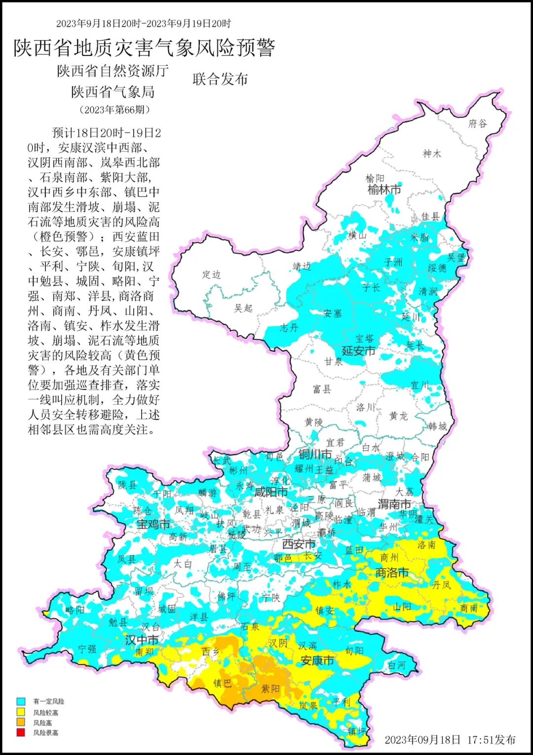 预计9月18日20时-19日20时,安康汉滨中西部、汉阴西南部、岚皋西北部、石泉南部、紫阳大部,汉中西乡中东部、镇巴中南部发生滑坡、崩塌、泥石流等地质灾害的风险高(橙色预警);西安蓝田、长安、鄠邑,安康镇坪、平利、宁陕、旬阳,汉中勉县、城固、略阳、宁强、南郑、洋县,商洛商州、商南、丹凤、山阳、洛南、镇安、柞水发生滑坡、崩塌、泥石流等地质灾害的风险较高(黄色预警),各地及有关部门单位要加强巡查排查,落实一线叫应机制,全力做好人员安全转移避险,上述相邻县区也需高度关注。