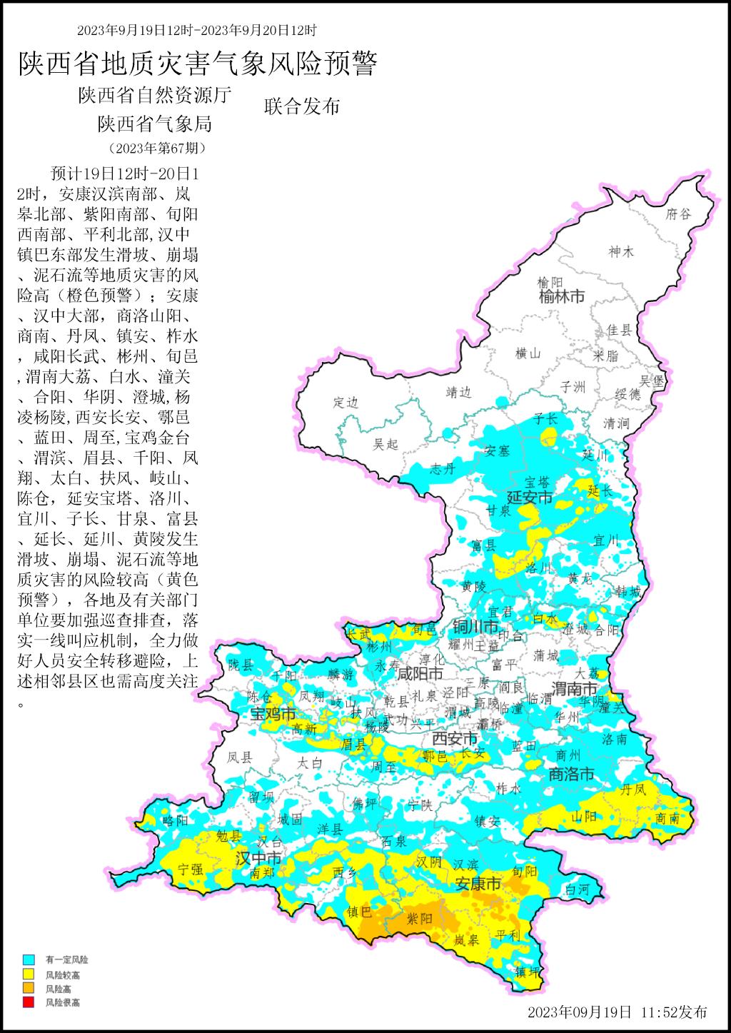 陕西省自然资源厅与陕西省气象局2023年9月19日11:52联合发布地质灾害气象风险预警:预计19日12时-20日12时,安康汉滨南部、岚皋北部、紫阳南部、旬阳西南部、平利北部,汉中镇巴东部发生滑坡、崩塌、泥石流等地质灾害的风险高(橙色预警);安康、汉中大部,商洛山阳、商南、丹凤、镇安、柞水,咸阳长武、彬州、旬邑,渭南大荔、白水、潼关、合阳、华阴、澄城,杨凌杨陵,西安长安、鄠邑、蓝田、周至,宝鸡金台、渭滨、眉县、千阳、凤翔、太白、扶风、岐山、陈仓,延安宝塔、洛川、宜川、子长、甘泉、富县、延长、延川、黄陵发生滑坡、崩塌、泥石流等地质灾害的风险较高(黄色预警),各地及有关部门单位要加强巡查排查,落实一线叫应机制,全力做好人员安全转移避险,上述相邻县区也需高度关注。