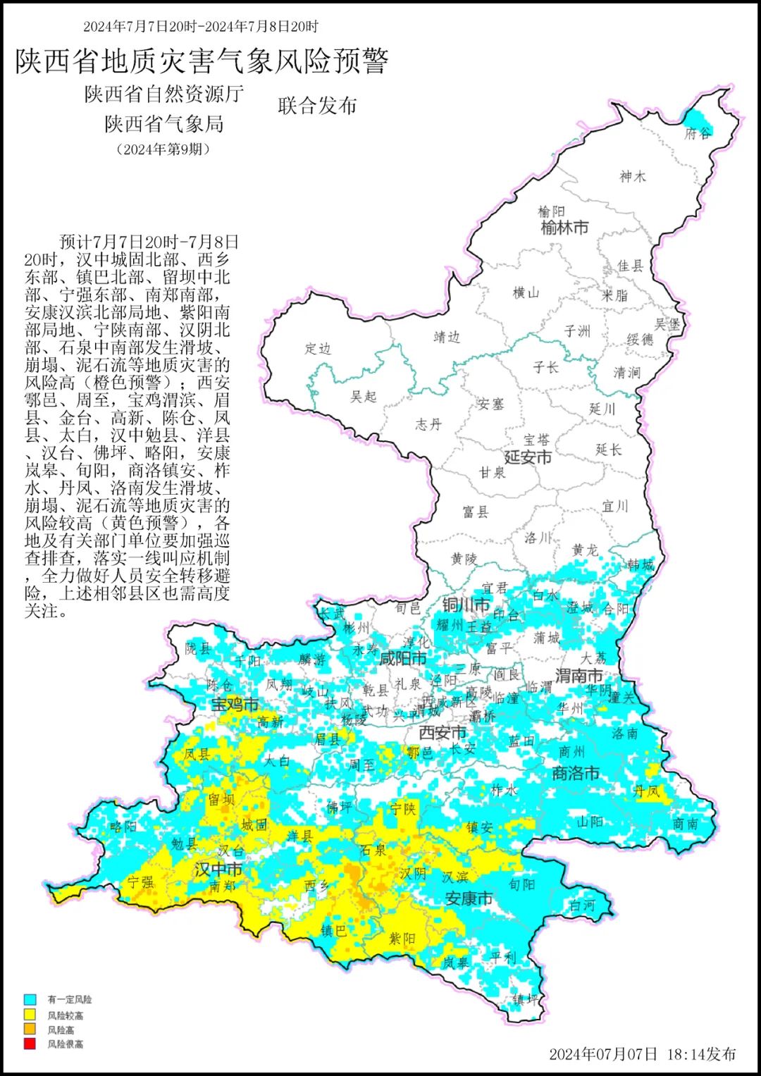 预计7月7日20时-7月8日20时,汉中城固北部、西乡东部、镇巴北部、留坝中北部、宁强东部、南郑南部,安康汉滨北部局地、紫阳南部局地、宁陕南部、汉阴北部、石泉中南部发生滑坡、崩塌、泥石流等地质灾害的风险高(橙色预警);西安鄠邑、周至,宝鸡渭滨、眉县、金台、高新、陈仓、凤县、太白,汉中勉县、洋县、汉台、佛坪、略阳,安康岚皋、旬阳,商洛镇安、柞水、丹凤、洛南发生滑坡、崩塌、泥石流等地质灾害的风险较高(黄色预警),各地及有关部门单位要加强巡查排查,落实一线叫应机制,全力做好人员安全转移避险,上述相邻县区也需高度关注。