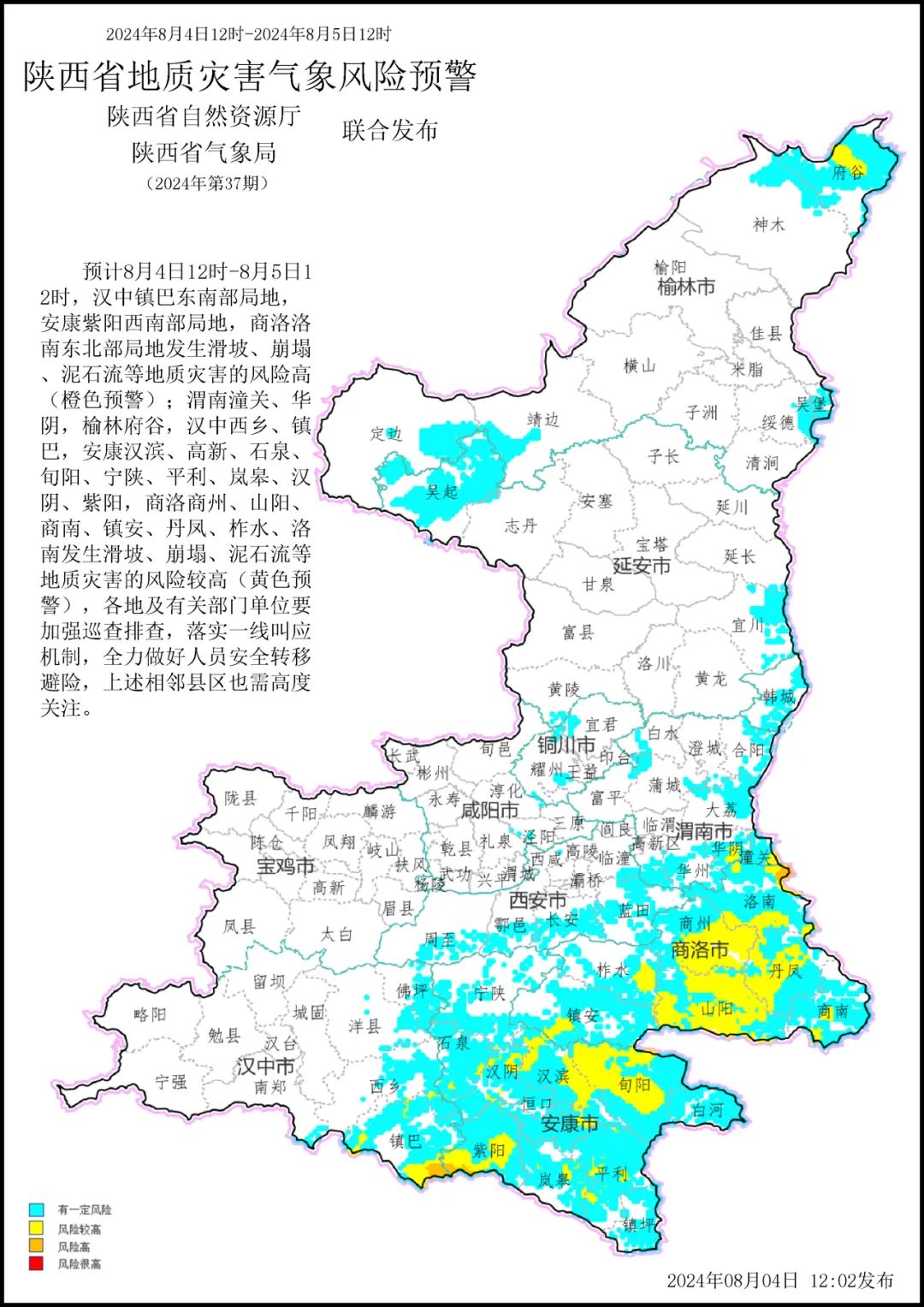 预计8月4日12时-8月5日12时,汉中镇巴东南部局地,安康紫阳西南部局地,商洛洛南东北部局地发生滑坡、崩塌、泥石流等地质灾害的风险高(橙色预警);渭南潼关、华阴,榆林府谷,汉中西乡、镇巴,安康汉滨、高新、石泉、旬阳、宁陕、平利、岚皋、汉阴、紫阳,商洛商州、山阳、商南、镇安、丹凤、柞水、洛南发生滑坡、崩塌、泥石流等地质灾害的风险较高(黄色预警),各地及有关部门单位要加强巡查排查,落实一线叫应机制,全力做好人员安全转移避险,上述相邻县区也需高度关注。