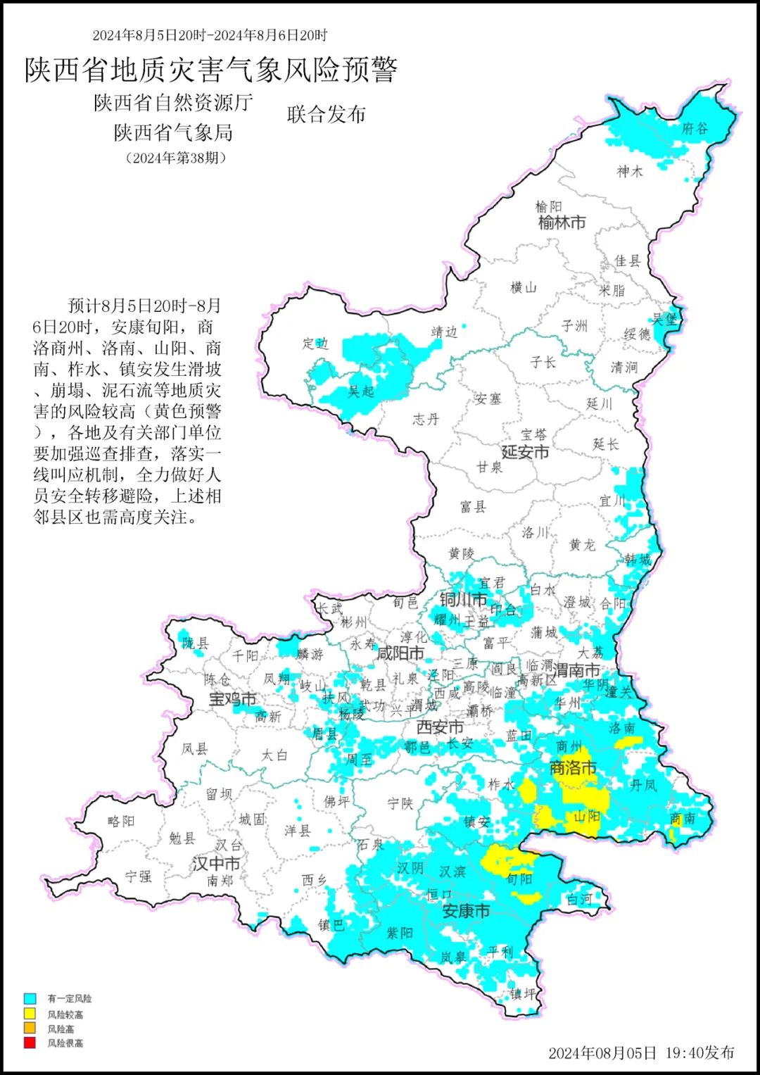 预计8月5日20时-8月6日20时,安康旬阳,商洛商州、洛南、山阳、商南、柞水、镇安发生滑坡、崩塌、泥石流等地质灾害的风险较高(黄色预警),各地及有关部门单位要加强巡查排查,落实一线叫应机制,全力做好人员安全转移避险,上述相邻县区也需高度关注。