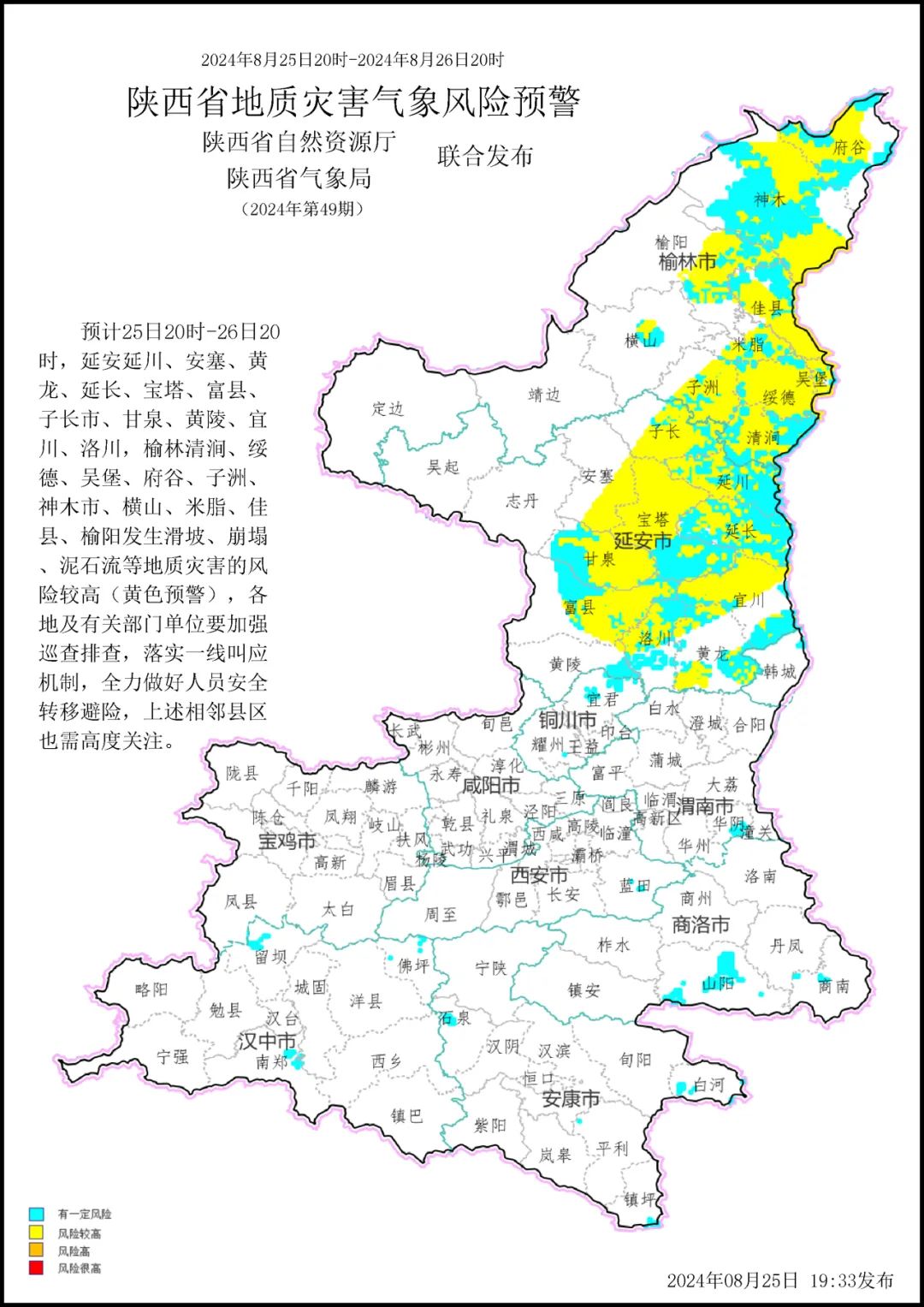 预计25日20:00-26日20:00,延安延川、安塞、黄龙、延长、宝塔、富县、子长市、甘泉、黄陵、宜川、洛川,榆林清涧、绥德、吴堡、府谷、子洲、神木市、横山、米脂、佳县、榆阳发生滑坡、崩塌、泥石流等地质灾害的风险较高(黄色预警),各地及有关部门单位要加强巡查排查, 落实一线叫应机制, 全力做好人员安全转移避险,上述相邻县区也需高度关注。