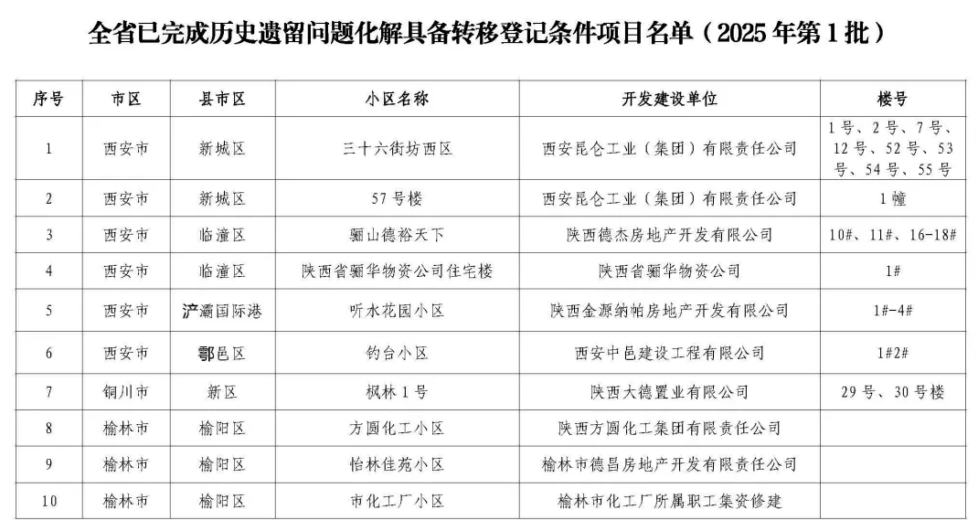 按照全省不动产“登记难”专项整治工作要求,为切实解决不动产“登记难”历史遗留问题,进一步提升知晓率,方便群众办理不动产转移登记。现将2025年第1批已完成历史遗留问题化解具备转移登记条件项目名单公告如下: