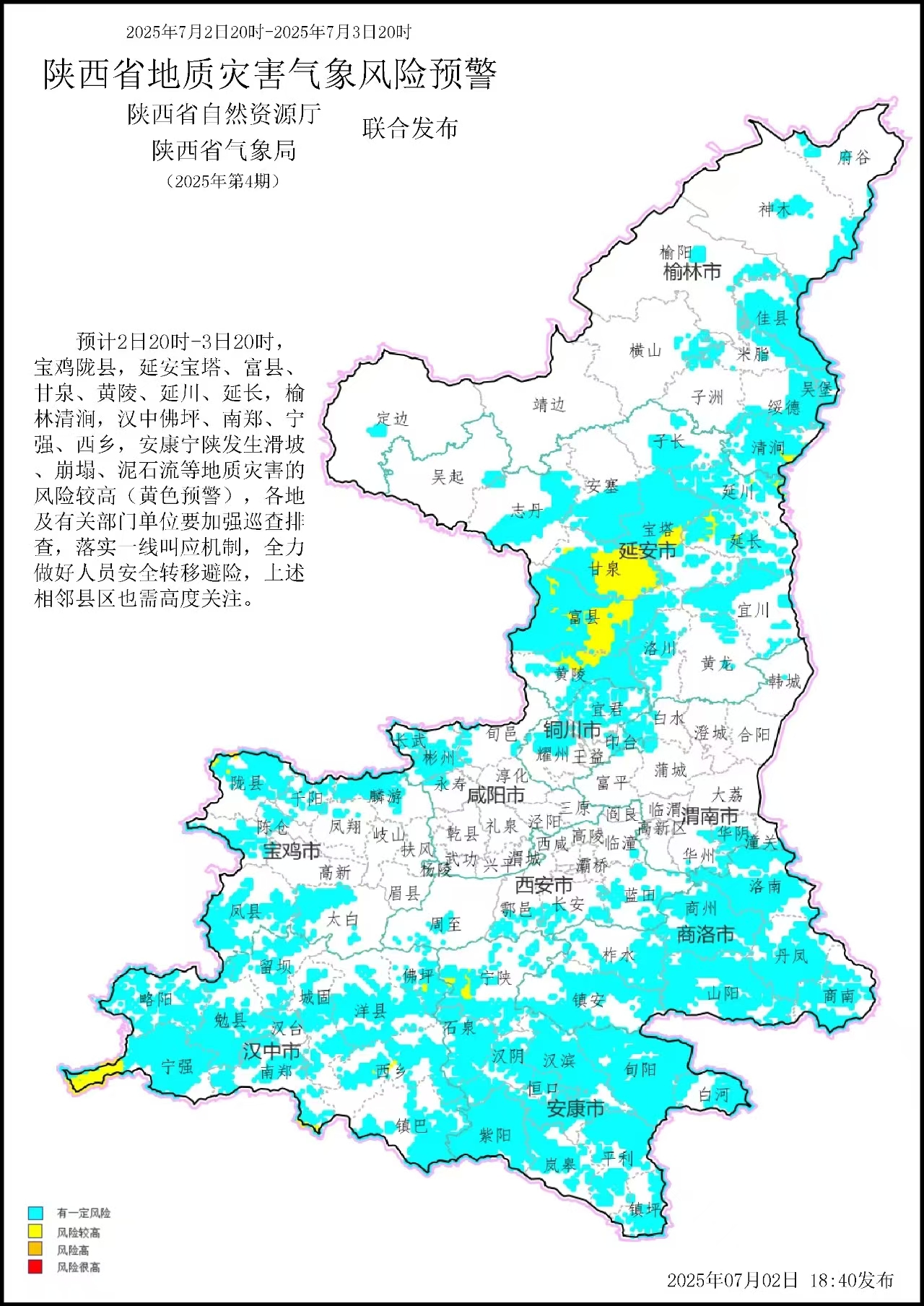 陕西省自然资源厅与陕西省气象局2025年7月2日18:40联合发布地质灾害气象风险预警:预计2日20时-3日20时,宝鸡陇县,延安宝塔、富县、甘泉、黄陵、延川、延长,榆林清涧,汉中佛坪、南郑、宁强、西乡,安康宁陕发生滑坡、崩塌、泥石流等地质灾害的风险较高(黄色预警),各地及有关部门单位要加强巡查排查,落实一线叫应机制,全力做好人员安全转移避险,上述相邻县区也需高度关注。