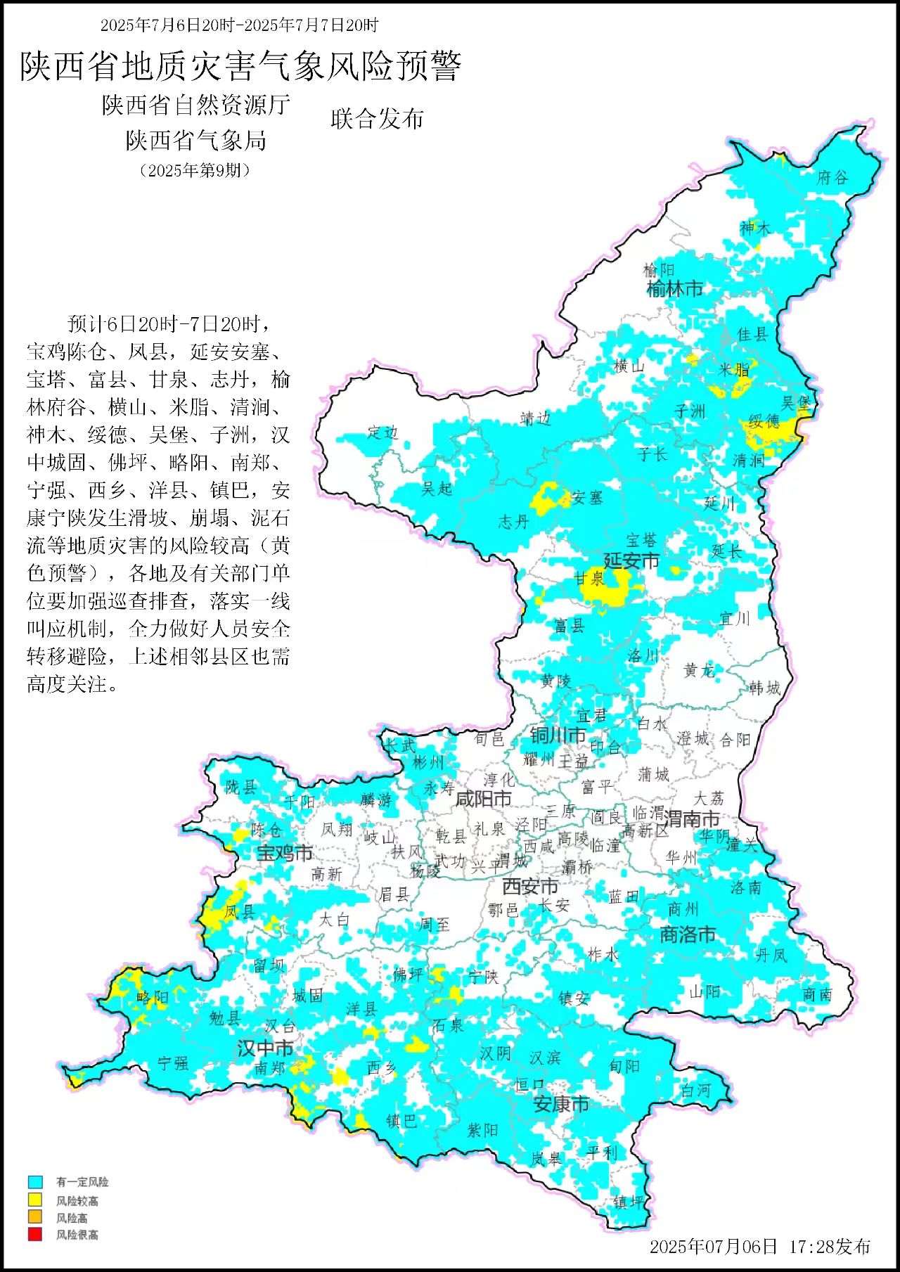 陕西省自然资源厅与陕西省气象局2025年7月6日17:28联合发布地质灾害气象风险预警:预计6日20时-7日20时,宝鸡陈仓、凤县,延安安塞、宝塔、富县、甘泉、志丹,榆林府谷、横山、米脂、清涧、神木、绥德、吴堡、子洲,汉中城固、佛坪、略阳、南郑、宁强、西乡、洋县、镇巴,安康宁陕发生滑坡、崩塌、泥石流等地质灾害的风险较高(黄色预警),各地及有关部门单位要加强巡查排查,落实一线叫应机制,全力做好人员安全转移避险,上述相邻县区也需高度关注。