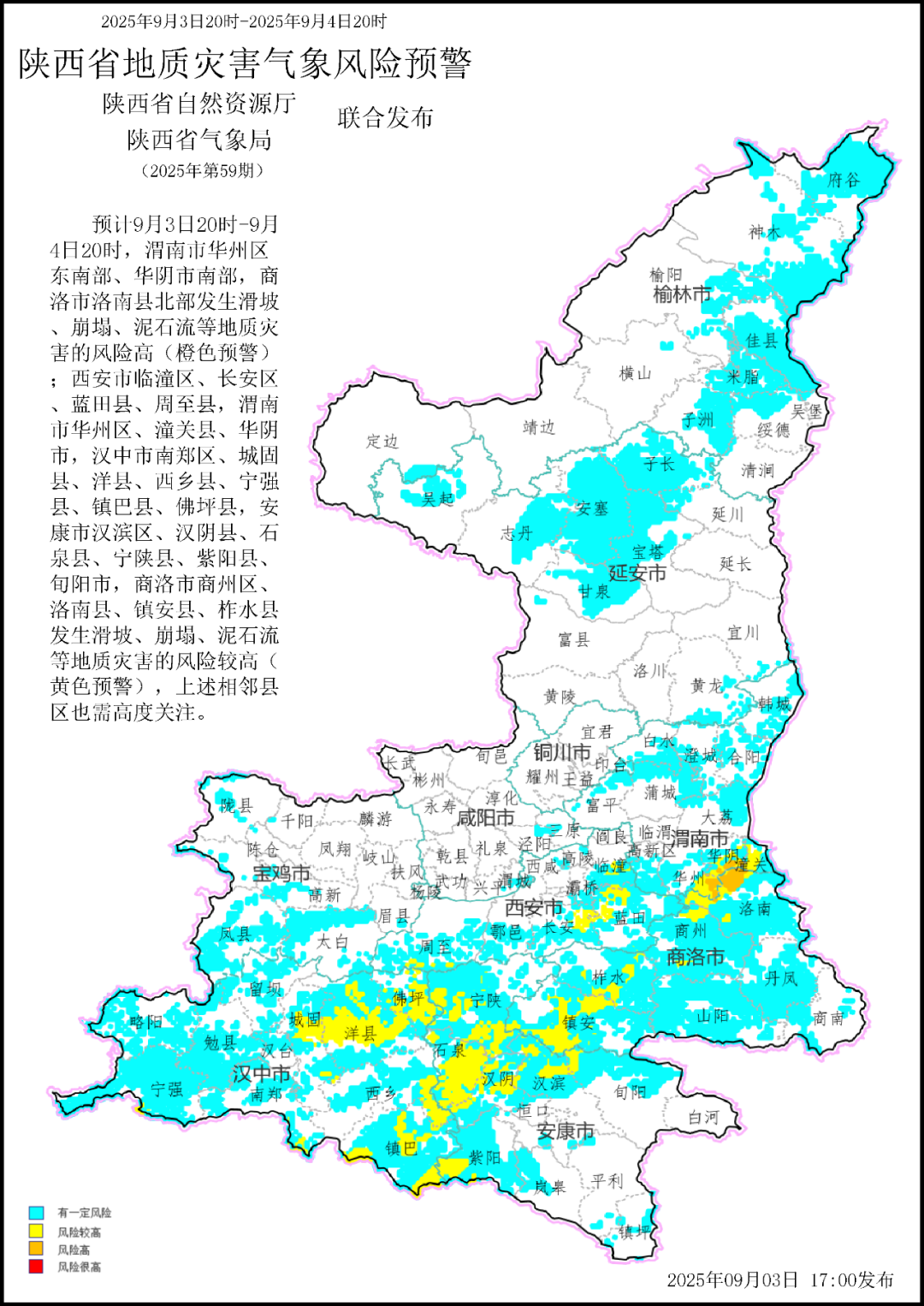 省自然资源厅联合省气象局2025年9月3日17时00分发布第59期地质灾害气象风险橙色预警:预计9月3日20时-9月4日20时,渭南市华州区东南部、华阴市南部,商洛市洛南县北部发生滑坡、崩塌、泥石流等地质灾害的风险高(橙色预警);西安市临潼区、长安区、蓝田县、周至县,渭南市华州区、潼关县、华阴市,汉中市南郑区、城固县、洋县、西乡县、宁强县、镇巴县、佛坪县,安康市汉滨区、汉阴县、石泉县、宁陕县、紫阳县、旬阳市,商洛市商州区、洛南县、镇安县、柞水县发生滑坡、崩塌、泥石流等地质灾害的风险较高(黄色预警),各地及有关部门单位要加强巡查排查,落实一线叫应机制,全力做好人员安全转移避险,上述相邻县区也需高度关注。