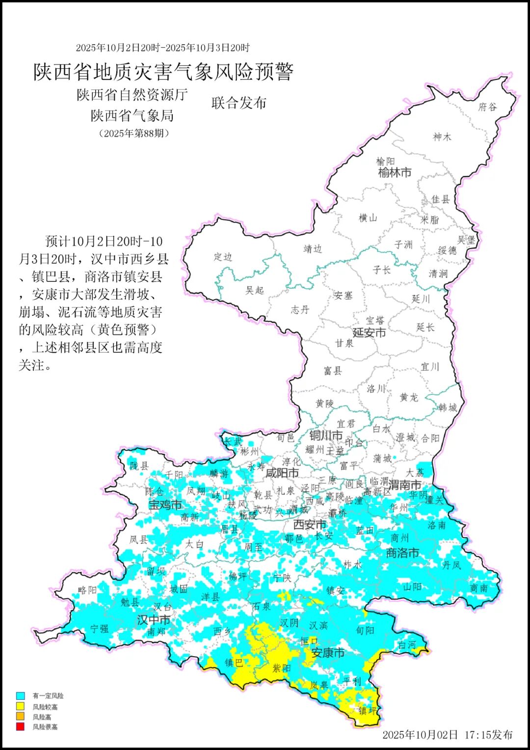 省自然资源厅联合省气象局2025年10月2日17时15分发布第88期地质灾害气象风险黄色预警:预计10月2日20时-10月3日20时,汉中市西乡县、镇巴县,商洛市镇安县,安康市大部发生滑坡、崩塌、泥石流等地质灾害的风险较高(黄色预警),各地及有关部门单位要加强巡查排查,落实一线叫应机制,全力做好人员安全转移避险,上述相邻县区也需高度关注。