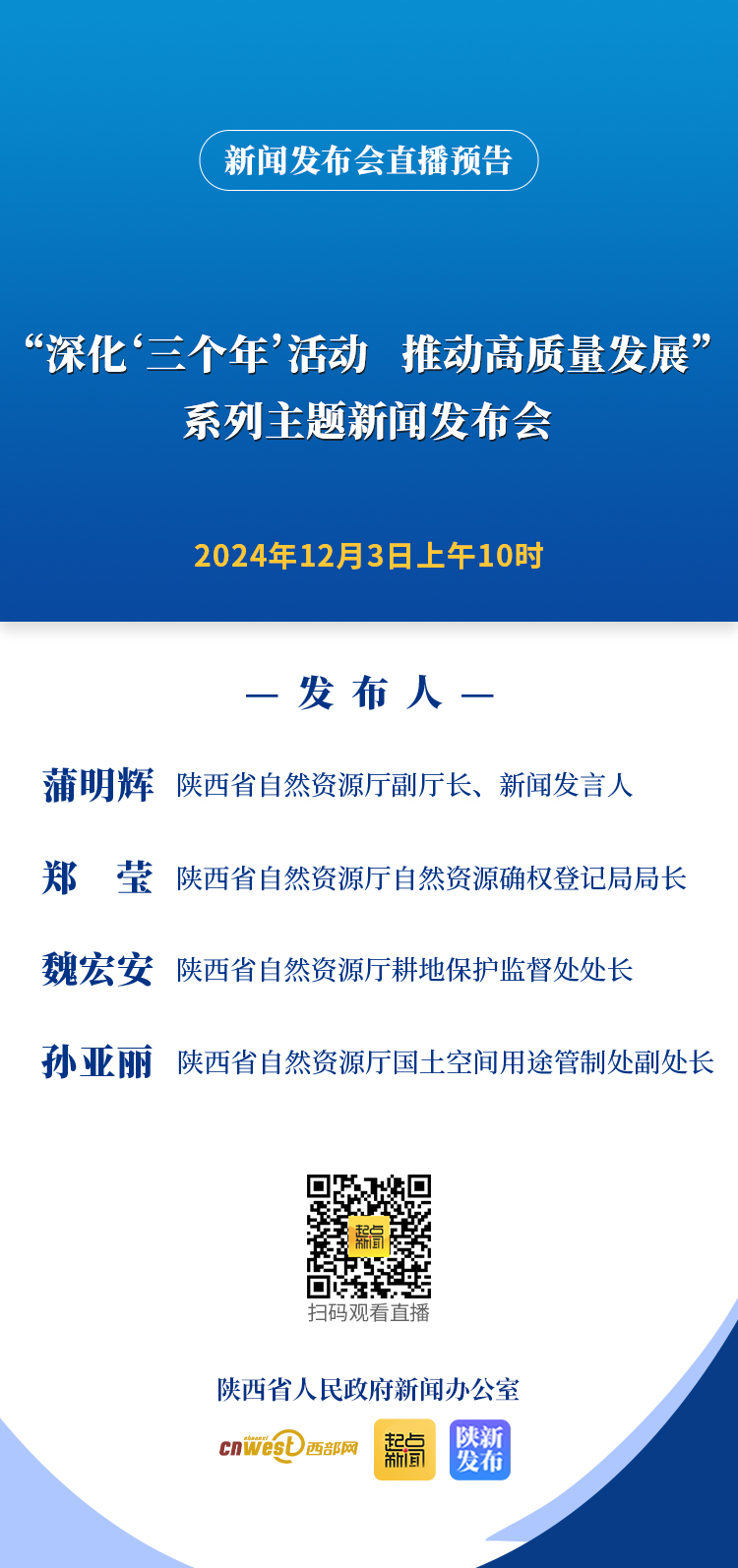 中共陕西省委宣传部、陕西省人民政府新闻办公室定于2024年12月3日(星期二)上午10时,举行“深化‘三个年’活动 推动高质量发展”系列主题新闻发布会,邀请陕西省自然资源厅负责同志,介绍“坚持守土有责、统筹发展保护、在深化三个年活动中推动高质量发展”情况,并回答记者提问。
