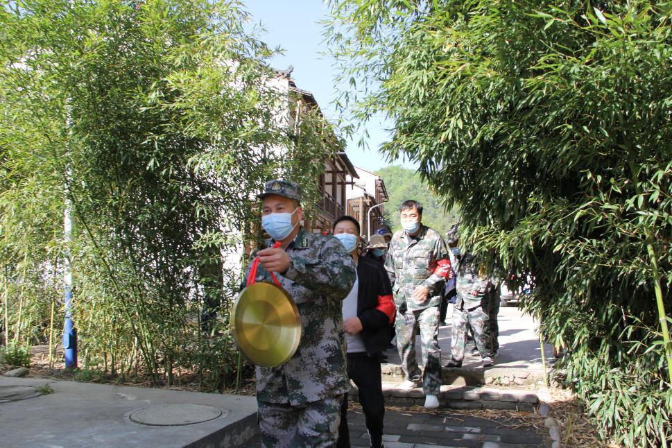 演练正式开始,监测人员一路小跑向现场总指挥汇报:“近期强降雨,我村滑坡隐患点出现数条裂缝,情况十分危急,请指示!”总指挥立即发布撤离命令,各小组成员随即奔赴隐患现场。“要滑坡了,大家赶紧跑!”伴随着信号发布员的呼喊声,锣声、警报声响彻街道,周围群众纷纷从房屋中快速撤离到指定的安全区域。
