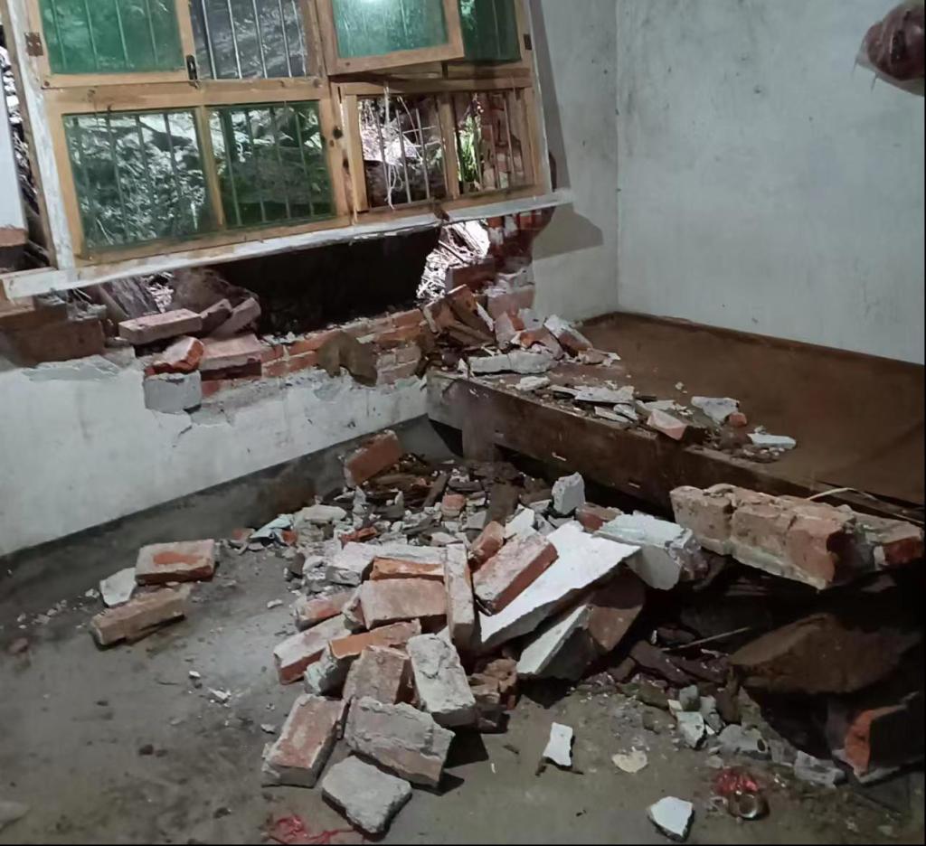由于受雨水浸泡冲刷,下午4时左右,该房后山体掉块情况加剧,一块巨石冲破树丛的阻拦,挟裹着泥浆猛地砸向了肖辉林家的后墙。墙体瞬间被砸出一个大窟窿,滚石、残砖混合着窗户玻璃碎片一起砸落在肖辉林平日休息的木架床上。