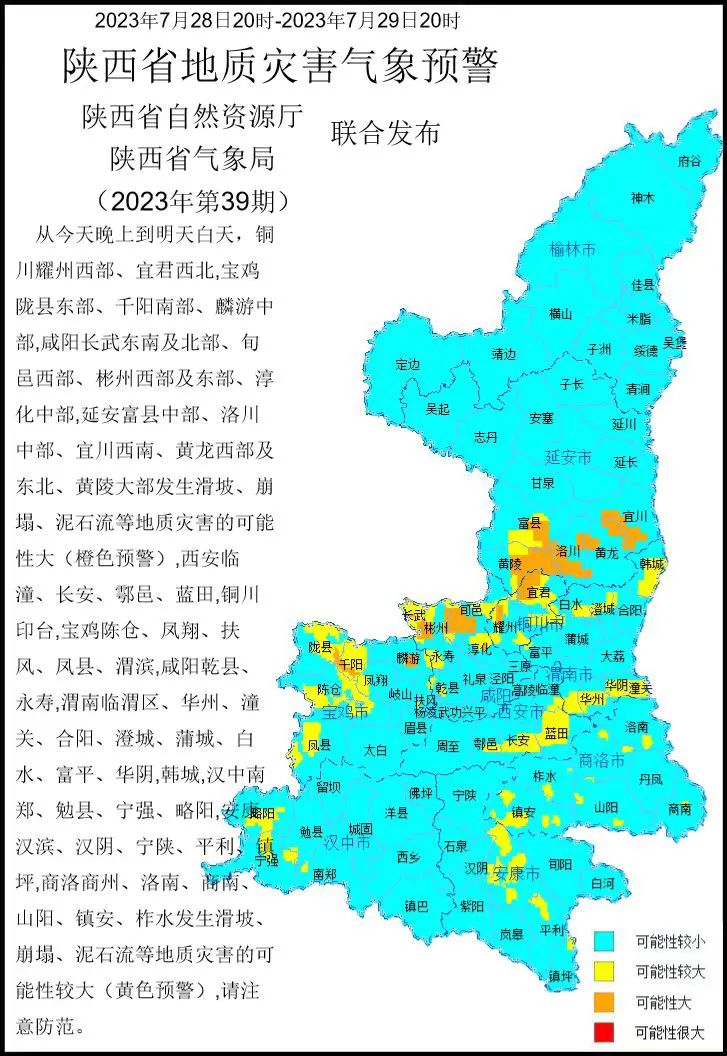 从7月28日晚上到7月29日白天,铜川耀州西部、宜君西北,宝鸡陇县东部、千阳南部、麟游中部,咸阳长武东南及北部、旬邑西部、彬州西部及东部、淳化中部,延安富县中部、洛川中部、宜川西南、黄龙西部及东北、黄陵大部发生滑坡、崩塌、泥石流等地质灾害的可能性大(橙色预警),西安临潼、长安、鄠邑、蓝田,铜川印台,宝鸡陈仓、凤翔、扶风、凤县、渭滨,咸阳乾县、永寿,渭南临渭、华州、潼关、合阳、澄城、蒲城、白水、富平、华阴,韩城,汉中南郑、勉县、宁强、略阳,安康汉滨、汉阴、宁陕、平利、镇坪,商洛商州、洛南、商南、山阳、镇安、柞水发生滑坡、崩塌、泥石流等地质灾害的可能性较大(黄色预警),请注意防范。