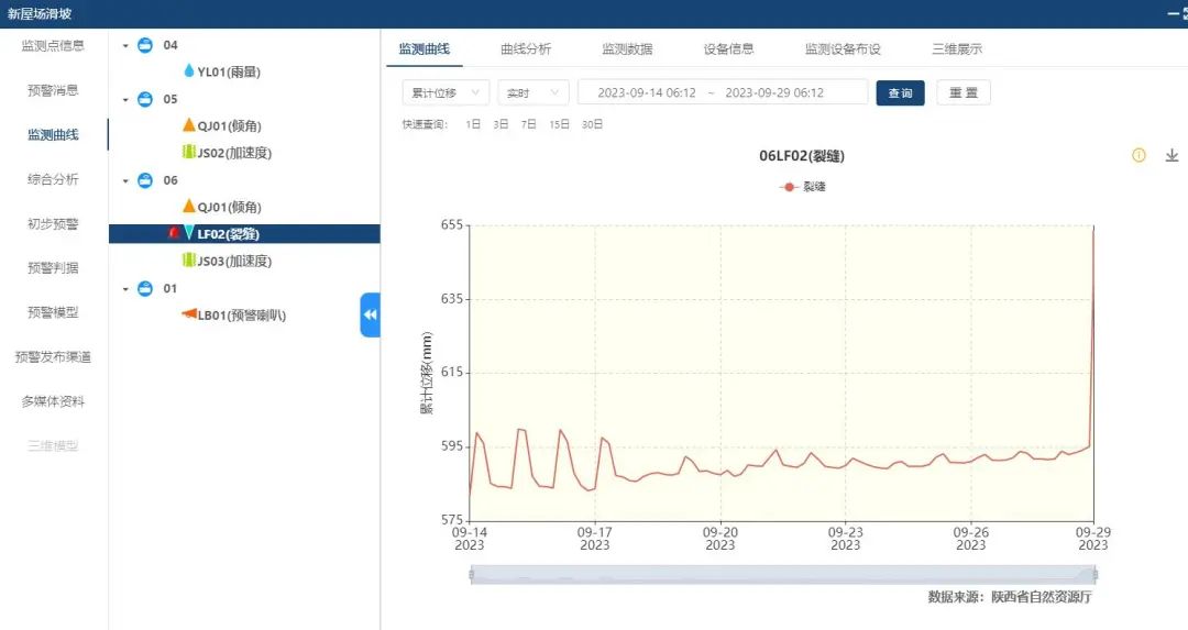 9月29日6时7分,新屋场滑坡隐患点普适型裂缝计监测值变化量达到47.6mm,触发黄色预警;6时11分裂缝值变化量达到 59mm,触发橙色预警;6时12分裂缝值变化量达到62mm,触发红色预警,并且裂缝变化量呈持续增大趋势。系统以短信方式通知技术人员和各级防灾责任人,县监测站立即联系八仙镇政府并安排群测群防人员奔赴现场进行核查。经现场核查,滑坡体中部存在多处错坎和局部滑塌,错台最大约40cm,后缘下错约1m,坡体上树木、电线杆倾斜,前缘挡墙出现鼓胀、前移等现象,综合研判处于强变形临滑阶段。29日7时,八仙镇狮坪村委会立即组织受威胁的3户5人紧急撤离避险。8时22分,滑坡发生,造成1间土木结构房屋被毁,直接经济损失2万元。因提前预警,人员及时撤离,成功避免1户2人伤亡。