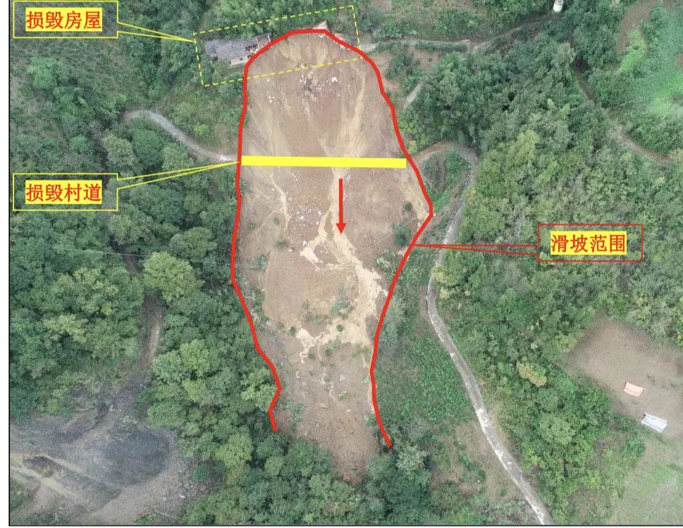 8月7日18时30分,村民朱琰在家中避雨时发现屋后坡体有土块滑塌、掉落现象,疑似滑坡前兆,立即呼喊在屋内避雨人员撤出房屋。18时35分左右,滑坡发生,造成1户2间房屋受损,直接经济损失5万元。由于村民发现前兆及时,撤离人员果断,成功避免16人伤亡(因当日该处住户家办葬礼,葬礼结束后突发大雨,主家及宾客共16人在家中避雨)。