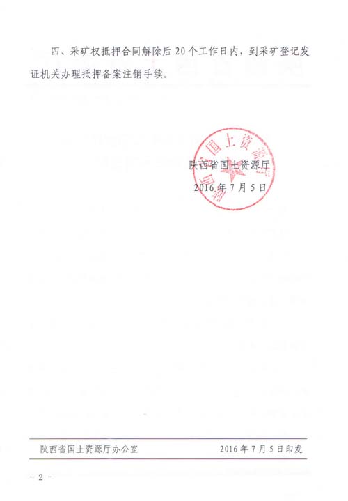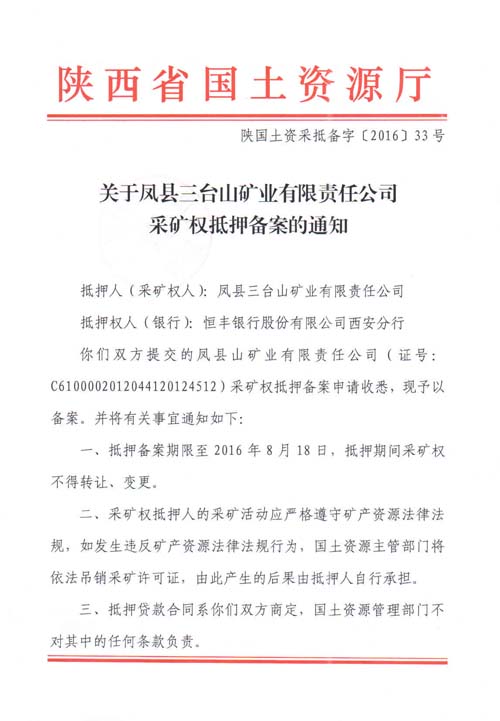 关于风县三台山矿业有限责任公司采矿权抵押备案的通知