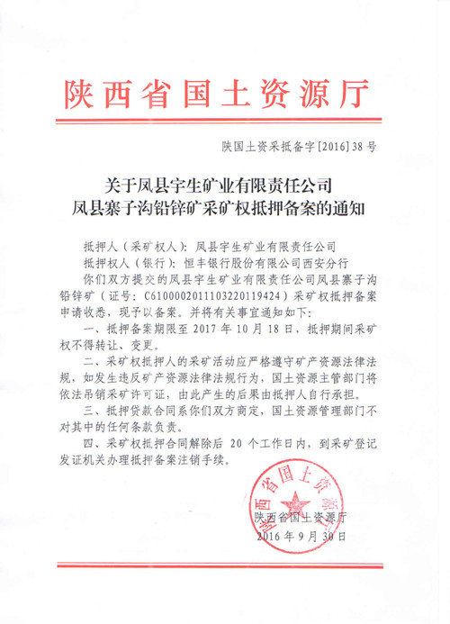关于凤县宇生矿业有限责任公司凤县寨子沟铅锌矿采矿权抵押备案的通知