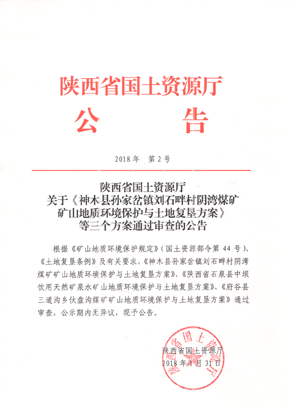陕西省国土资源厅关于《神木县孙家岔镇刘石畔村阴湾煤矿矿山地质环境保护与土地复垦方案》等三个方案通过审查的公告